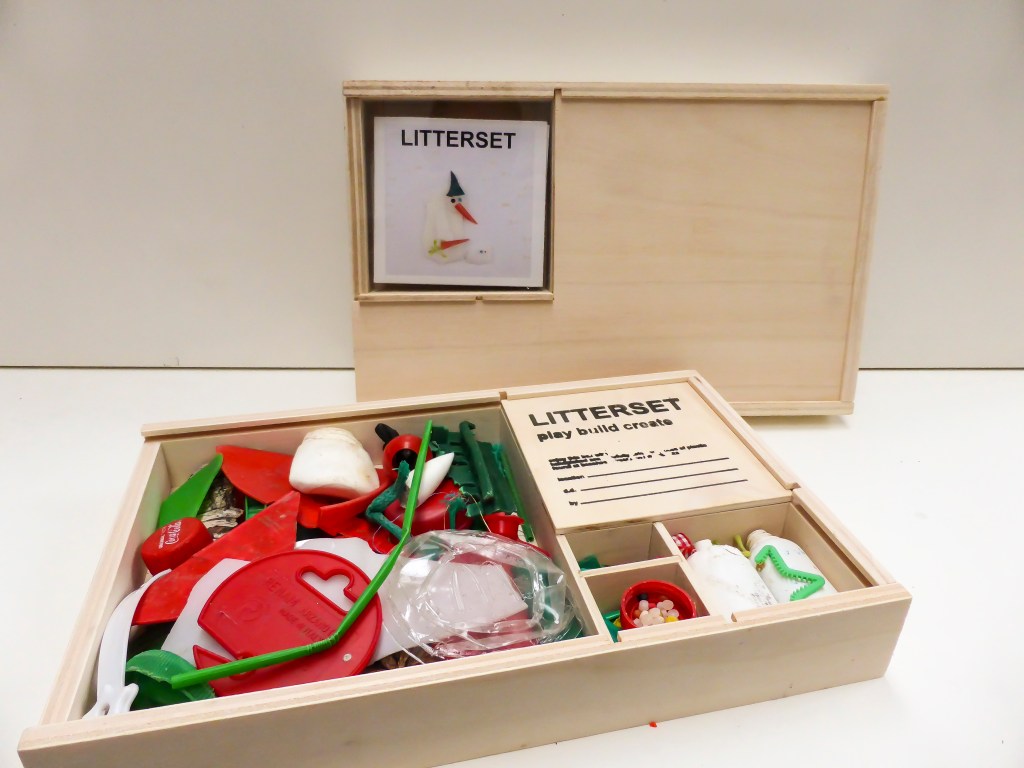 LITTERSET is an art-project that stimulates to play. Apart from handpicked and carefully selected pieces of plastic trash, each LITTERSET contains a unique artwork. The artwork is shown in the booklet and can be put together by the buyer. Information on the location, date and finder is given on front of the package. The pieces of plastic are chosen based on safety, color and shape. The box itself is handmade of poplar wood and acrylic glass.